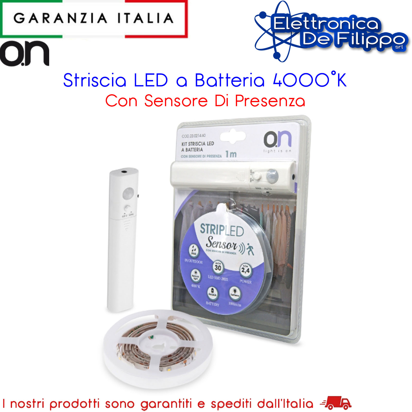 Striscia IP65 con 30 led SMD 2835. Ideale per armadi, sottoscala, sotto letto, balconi. Alimentata a batterie (non fornite) per la massima flessibilità di installazione. Sensore PIR in dotazione. È possibile selezionare la funzione manuale o automatica con sensore attraverso l'apposito switch presente sul controller.