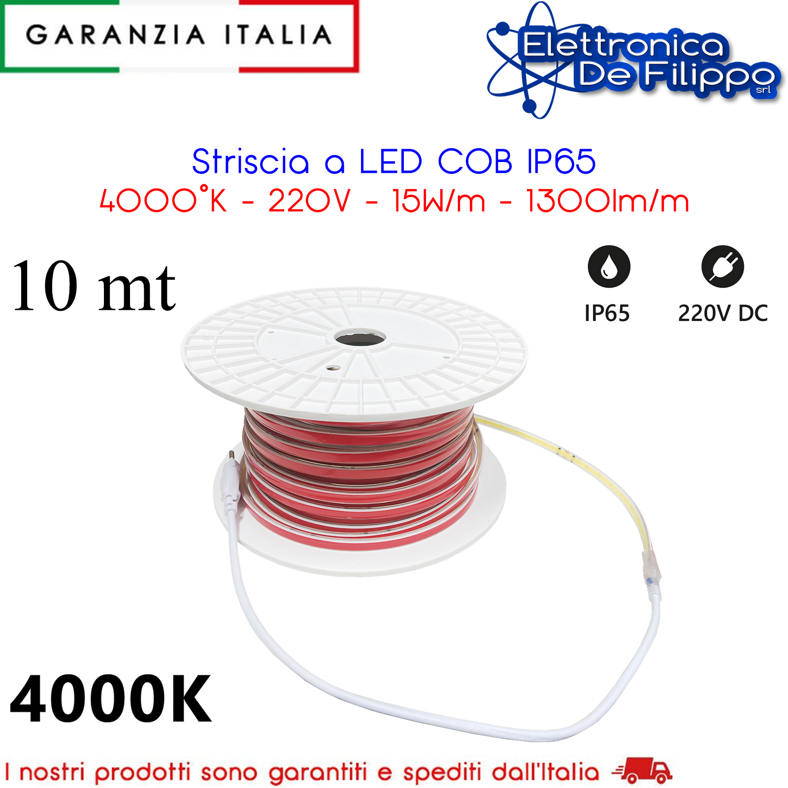 Striscia a LED COB IP65 4000K - 220V - 15W/m - 1300lm/m - 10 Metri