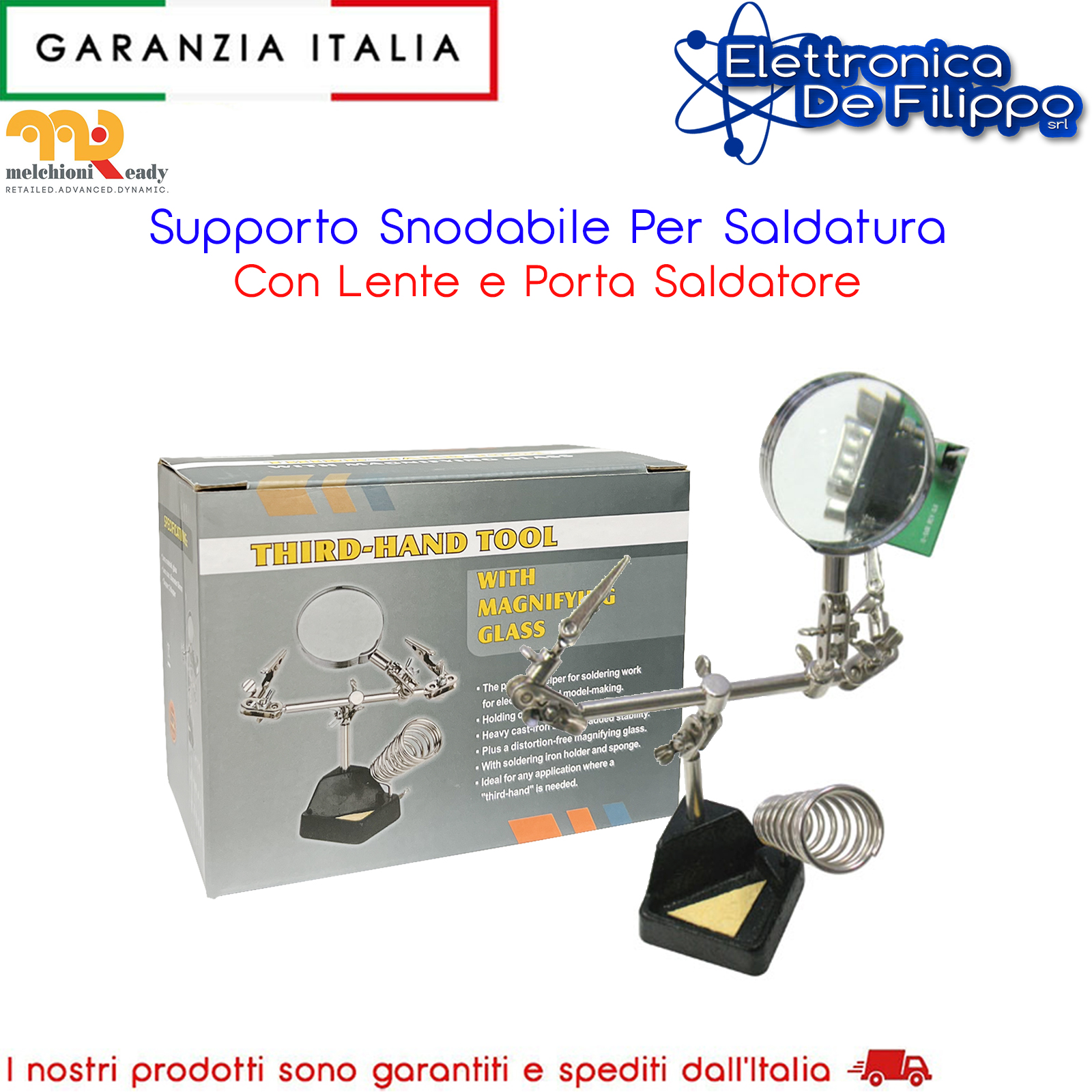 Supporto snodabile per saldatura con lente e porta saldatore. Strumento ideale per hobbisti e laboratori. Pratico e robusto supporto snodabile dotato di: