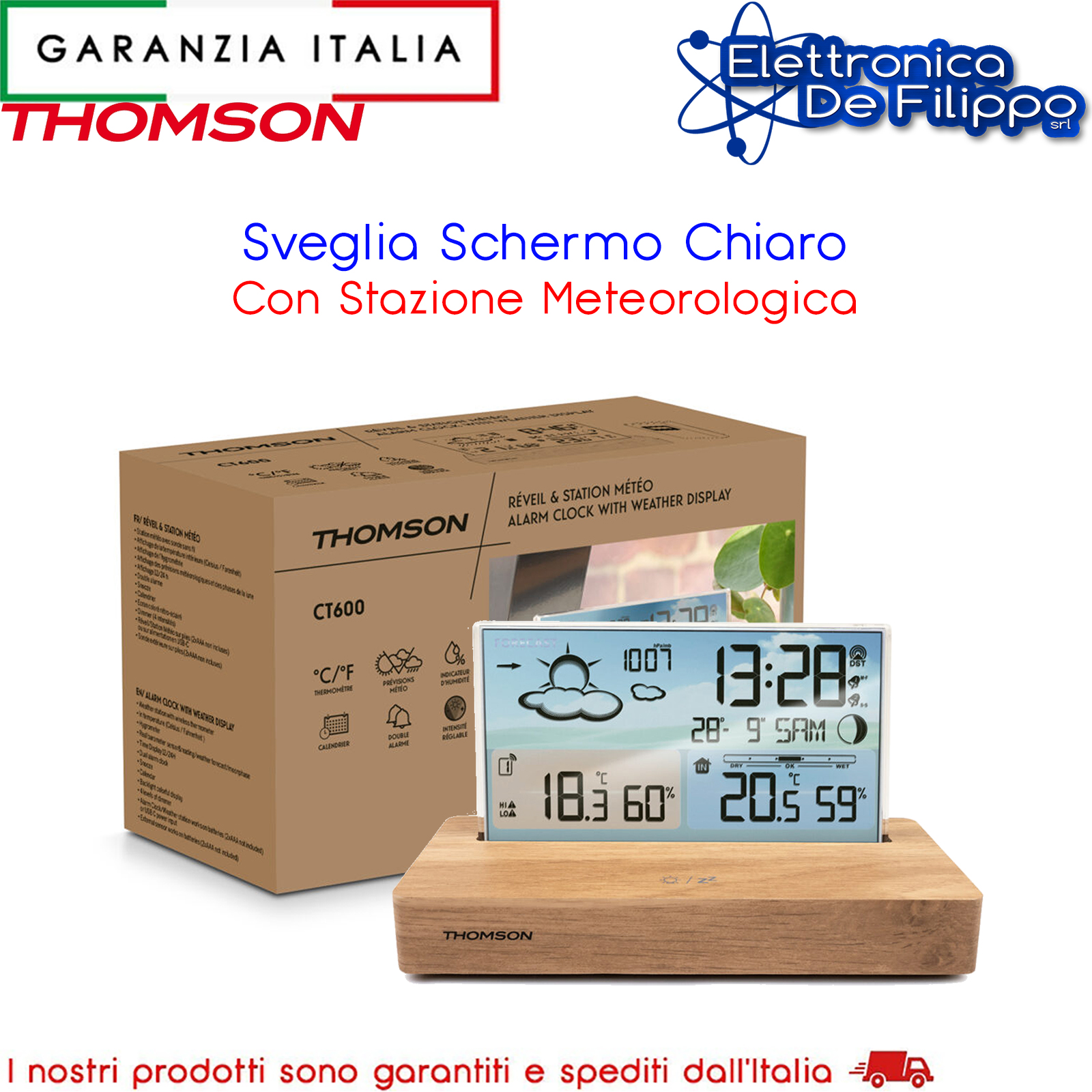 La Sveglia CT600 di Thomson / Bigben è una stazione meteorologica elegante con finitura in legno chiaro, progettata per unire utilità e design. Grazie alla sonda wireless, puoi rilevare la temperatura esterna e visualizzare altri dati climatici comodamente sul display principale. Il grande schermo a colori retroilluminato mostra la temperatura interna (in °C o °F), l’umidità, le previsioni meteo e le fasi lunari, offrendo una panoramica completa dell’ambiente. Ha doppia sveglia con funzione snooze, così puoi impostare due orari diversi secondo le tue esigenze. Il calendario integrato e il formato orario selezionabile (12/24 ore) rendono l’utilizzo quotidiano ancora più flessibile. Il display ha un dimmer regolabile su 4 livelli, così puoi regolare la luminosità in base all’ambiente. Per l’alimentazione, puoi usare due batterie AAA oppure collegare un alimentatore via USB?C: lo stesso vale per la sonda esterna.