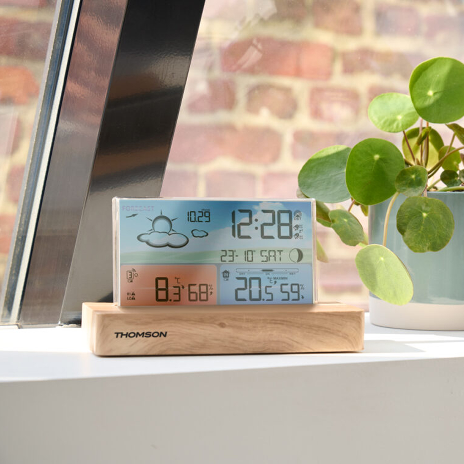 La Sveglia CT600 di Thomson / Bigben è una stazione meteorologica elegante con finitura in legno chiaro, progettata per unire utilità e design. Grazie alla sonda wireless, puoi rilevare la temperatura esterna e visualizzare altri dati climatici comodamente sul display principale. Il grande schermo a colori retroilluminato mostra la temperatura interna (in °C o °F), l’umidità, le previsioni meteo e le fasi lunari, offrendo una panoramica completa dell’ambiente. Ha doppia sveglia con funzione snooze, così puoi impostare due orari diversi secondo le tue esigenze. Il calendario integrato e il formato orario selezionabile (12/24 ore) rendono l’utilizzo quotidiano ancora più flessibile. Il display ha un dimmer regolabile su 4 livelli, così puoi regolare la luminosità in base all’ambiente. Per l’alimentazione, puoi usare due batterie AAA oppure collegare un alimentatore via USB?C: lo stesso vale per la sonda esterna.