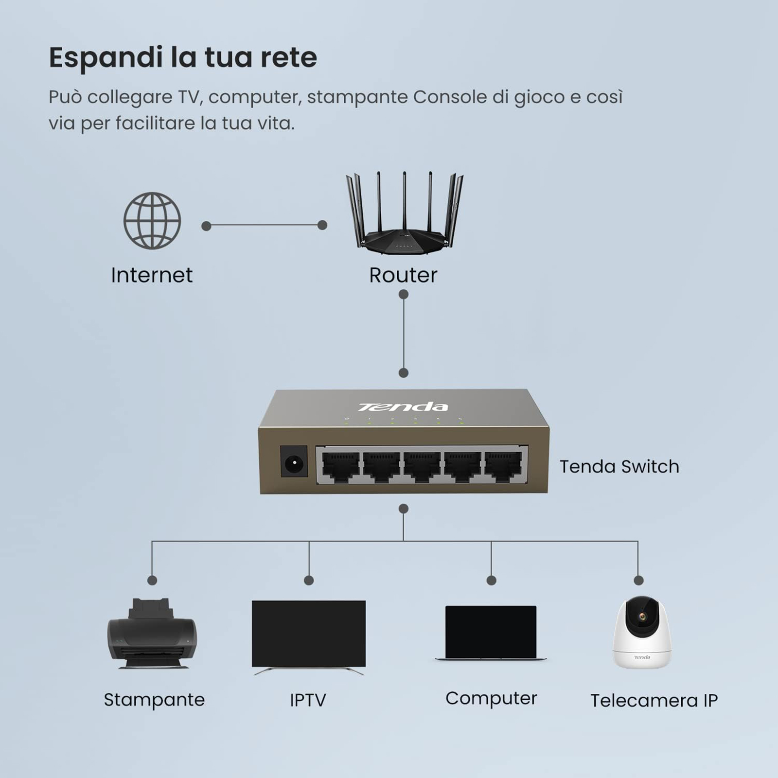 Switch 10/100/1000 Gigabit full duplex totalmente plug & play; Porte auto negozianti, compatibile con la modalità store & forward, per mantenere il segnale stabile anche su lunghe distanze. Scocca in metallo