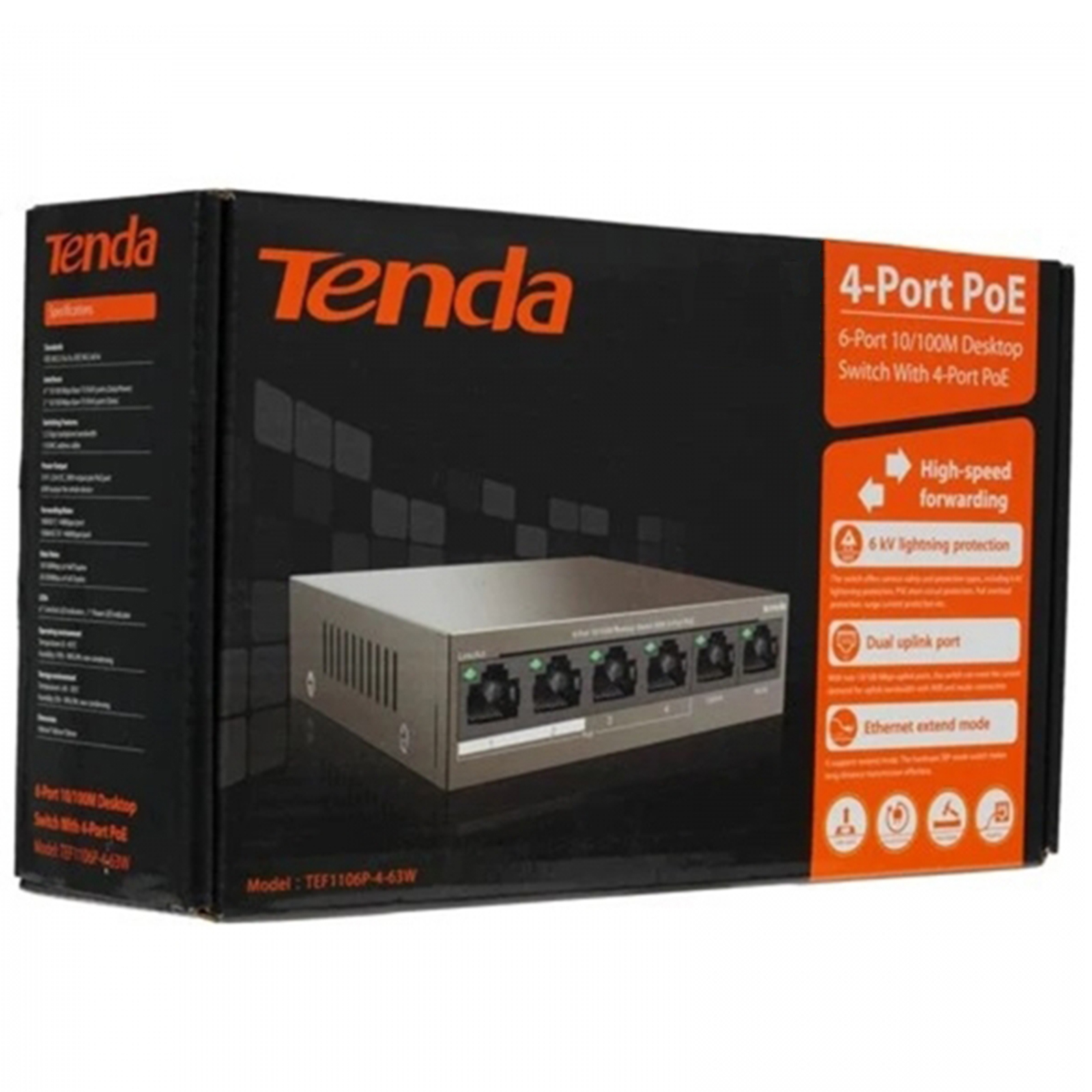 TEF1106P-4-63W è uno switch PoE non gestito con 2 porte uplink, progettato in modo indipendente da Tenda. Conforme agli standard IEEE 802.3at/af, è in grado di identificare in modo intelligente i dispositivi alimentati da PoE. Lo switch fornisce un'uscita di potenza PoE massima di 63 W e 30 W per una singola porta. Dotato di modalità estesa e funzione QoS, TEF1106P-4-63W è la scelta ideale per PMI, supermercati e ristoranti con requisiti di videosorveglianza di piccole dimensioni.