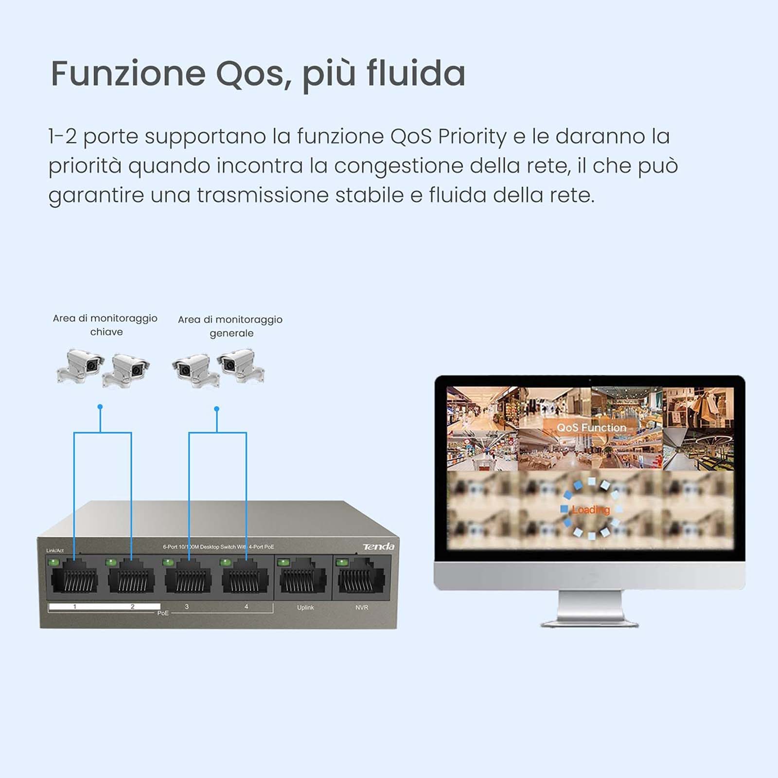 1-2 porte supportano la funzione di priorità QoS e darà loro la priorità in caso di congestione della rete, che può garantire una trasmissione stabile e fluida della rete del video di sorveglianza senza interruzioni.