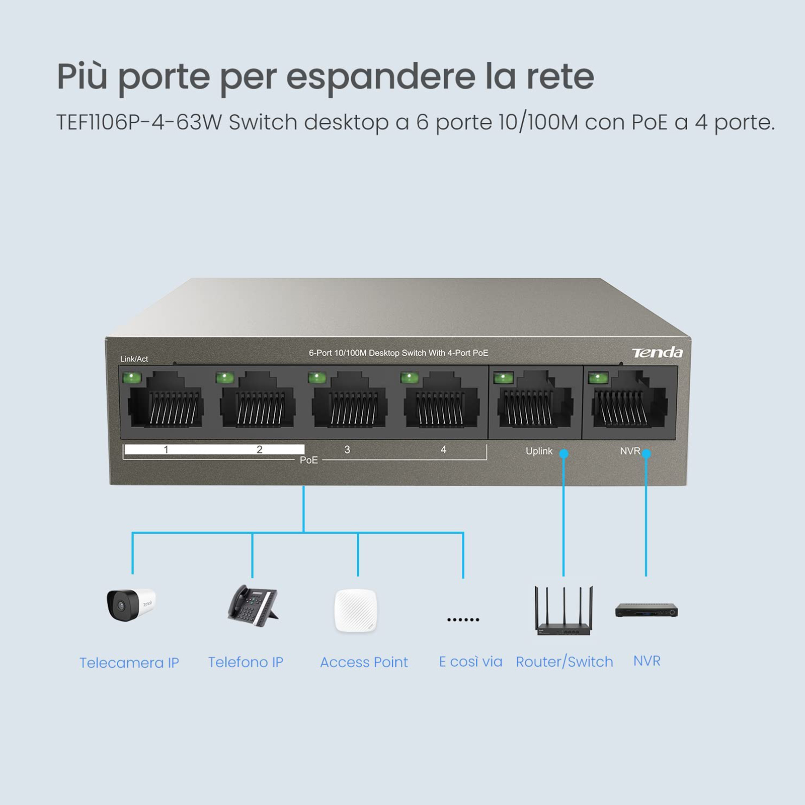 TEF1106P-4-63W è uno switch PoE non gestito con 2 porte uplink, progettato in modo indipendente da Tenda. Conforme agli standard IEEE 802.3at/af, è in grado di identificare in modo intelligente i dispositivi alimentati da PoE. Lo switch fornisce un'uscita di potenza PoE massima di 63 W e 30 W per una singola porta. Dotato di modalità estesa e funzione QoS, TEF1106P-4-63W è la scelta ideale per PMI, supermercati e ristoranti con requisiti di videosorveglianza di piccole dimensioni.