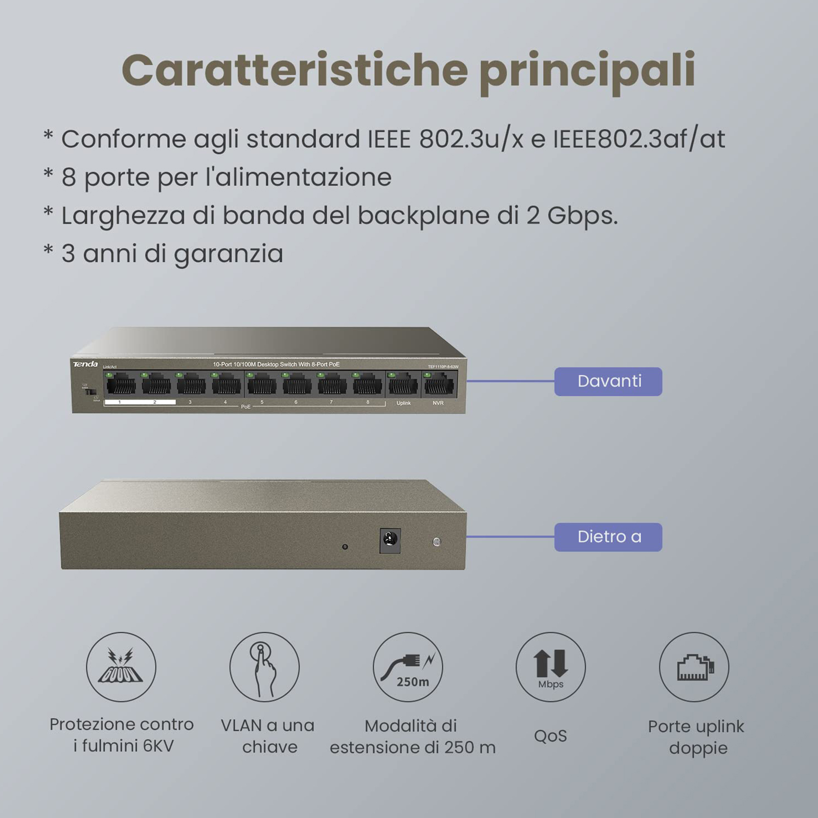 TEF1110P-8-63W è uno switch PoE non gestito con 2 porte uplink che possono connettersi con router e NVR. Conforme agli standard IEEE 802.3at/af, è in grado di identificare in modo intelligente i dispositivi alimentati da PoE. Lo switch fornisce un'uscita di potenza PoE massima di 58 W e 30 W per una singola porta. TEF1110P-8-63W è la scelta ideale per PMI, supermercati e ristoranti con esigenze di videosorveglianza di piccole dimensioni.