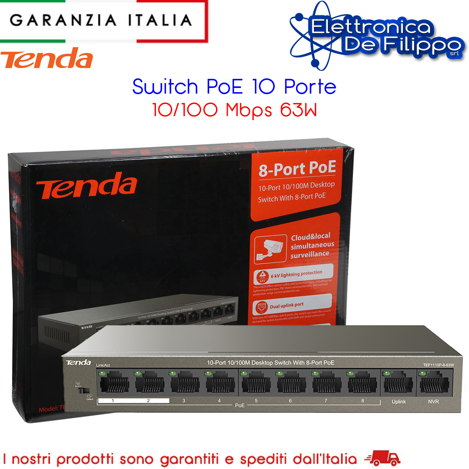 TEF1110P-8-63W è uno switch PoE non gestito con 2 porte uplink, progettato in modo indipendente da Tenda. Conforme agli standard IEEE 802.3at/af, è in grado di identificare in modo intelligente i dispositivi alimentati da PoE. Lo switch fornisce un'uscita di potenza PoE massima di 63 W e 30 W per una singola porta. Dotato di modalità estesa, VLAN One-key e funzioni QoS, TEF1110P-8-63W è la scelta ideale per PMI, supermercati e ristoranti con requisiti di videosorveglianza di piccole dimensioni.