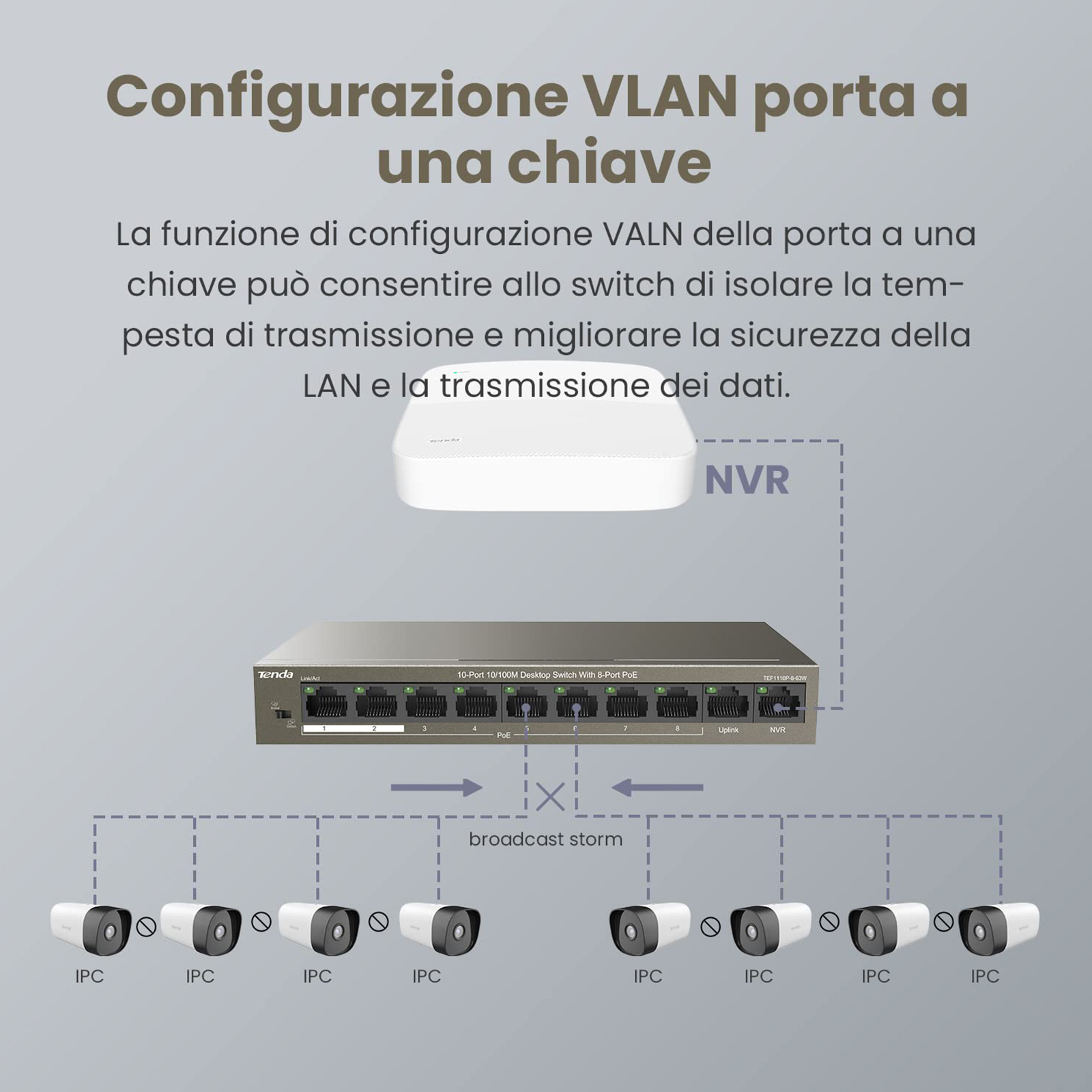 - Interfacce: 8 x 10/100 Base-TX Ethernet ports (Data/Power), 2 x 10/100 Base-TX Ethernet ports (Data)