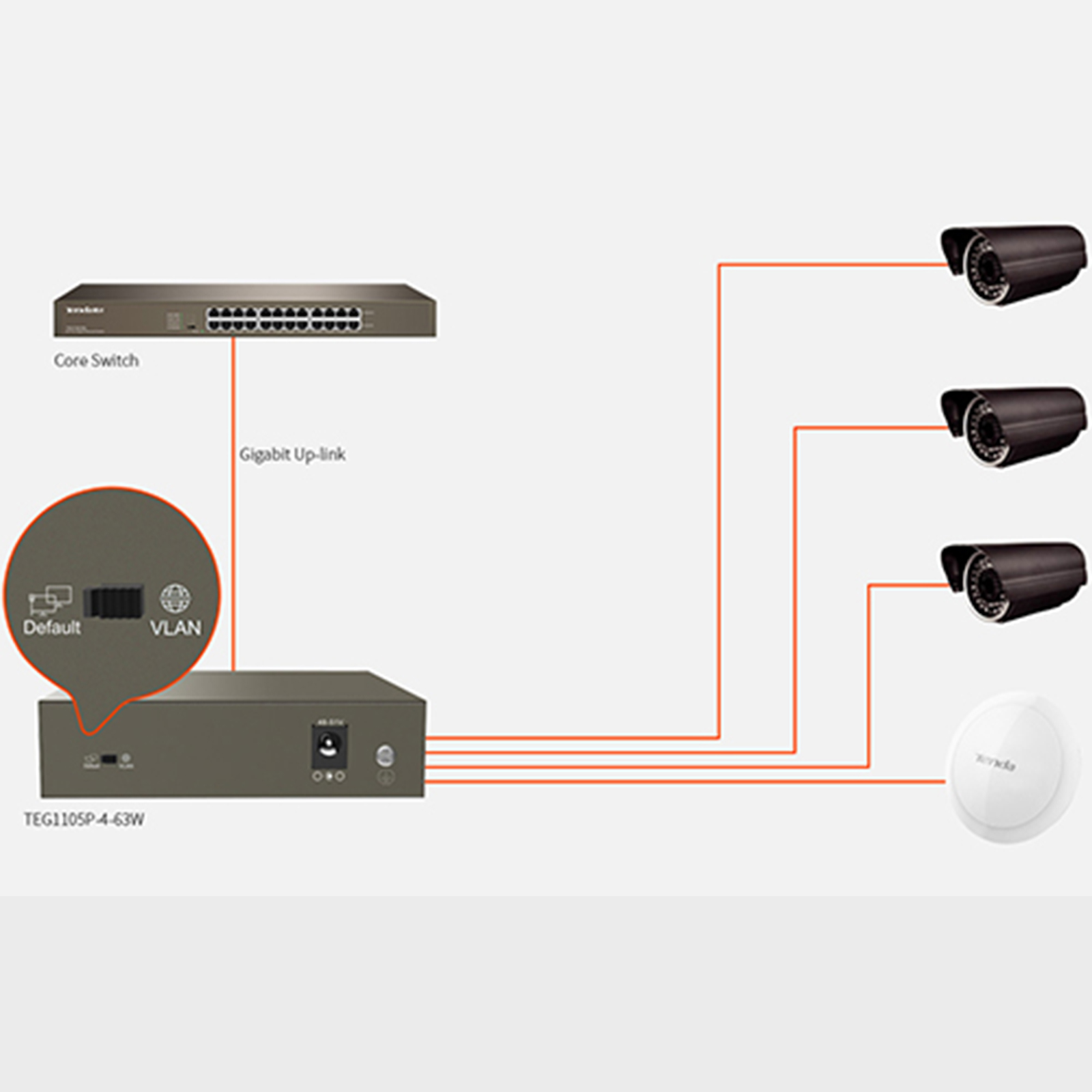 Le porte 1-4 sono conformi agli standard di alimentazione IEEE802.3af e IEEE802.3at. L'intero switch offre una potenza di uscita PoE massima di 58W, mentre ciascuna porta offre una potenza di uscita PoE massima di 30W. Le porte possono essere utilizzate per fornire alimentazione e scambiare dati con Access Point e telecamere IP.