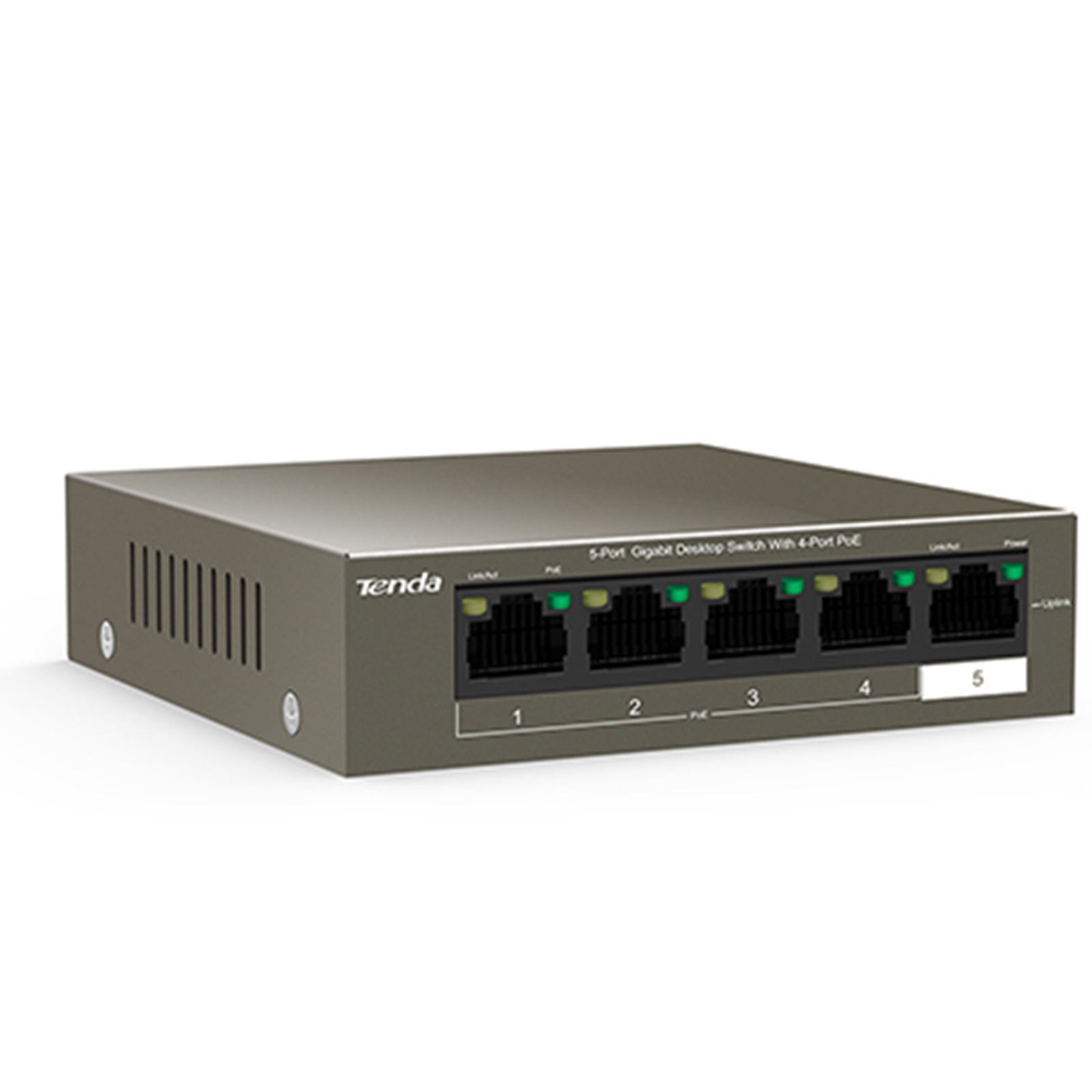 Tenda TEG1105P-4-63W è uno switch PoE che offre 5 porte RJ45 Base-TX 10/100/1000 Mbps. Le porte 1-4 sono conformi allo standard IEEE 802.3af (potenza massima PoE: 15,4 W) e allo standard 802.3at (potenza massima PoE: 30 W). Lo switch offre una potenza PoE massima di 58 W e può fornire alimentazione e scambiare dati con AP, telecamere IP e telefoni IP tramite l’utilizzo di cavi CAT5 (e categoria superiore). Fornisce inoltre la modalità di gestione VLAN.