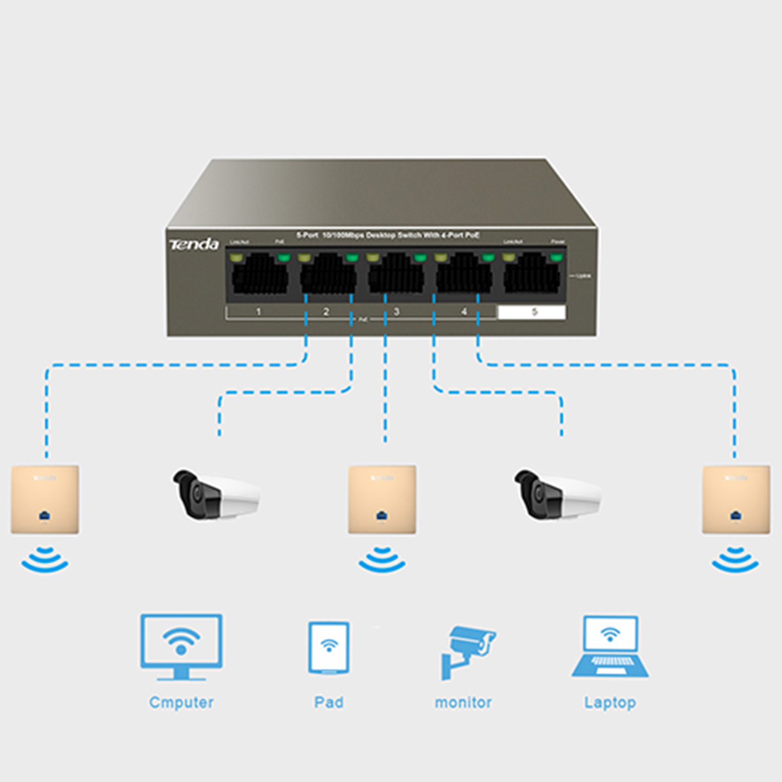 Le porte 1-4 sono conformi agli standard di alimentazione IEEE802.3af e IEEE802.3at. L'intero switch offre una potenza di uscita PoE massima di 58W, mentre ciascuna porta offre una potenza di uscita PoE massima di 30W. Le porte possono essere utilizzate per fornire alimentazione e scambiare dati con Access Point e telecamere IP.