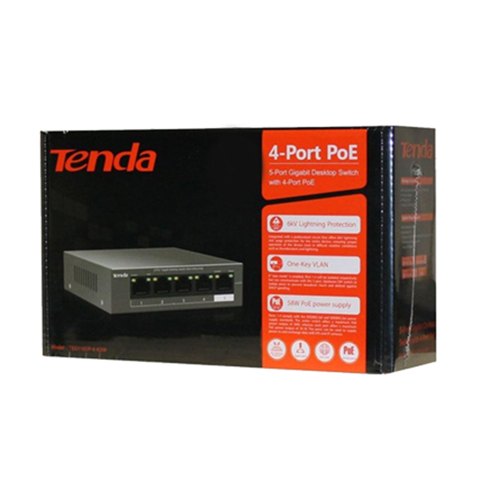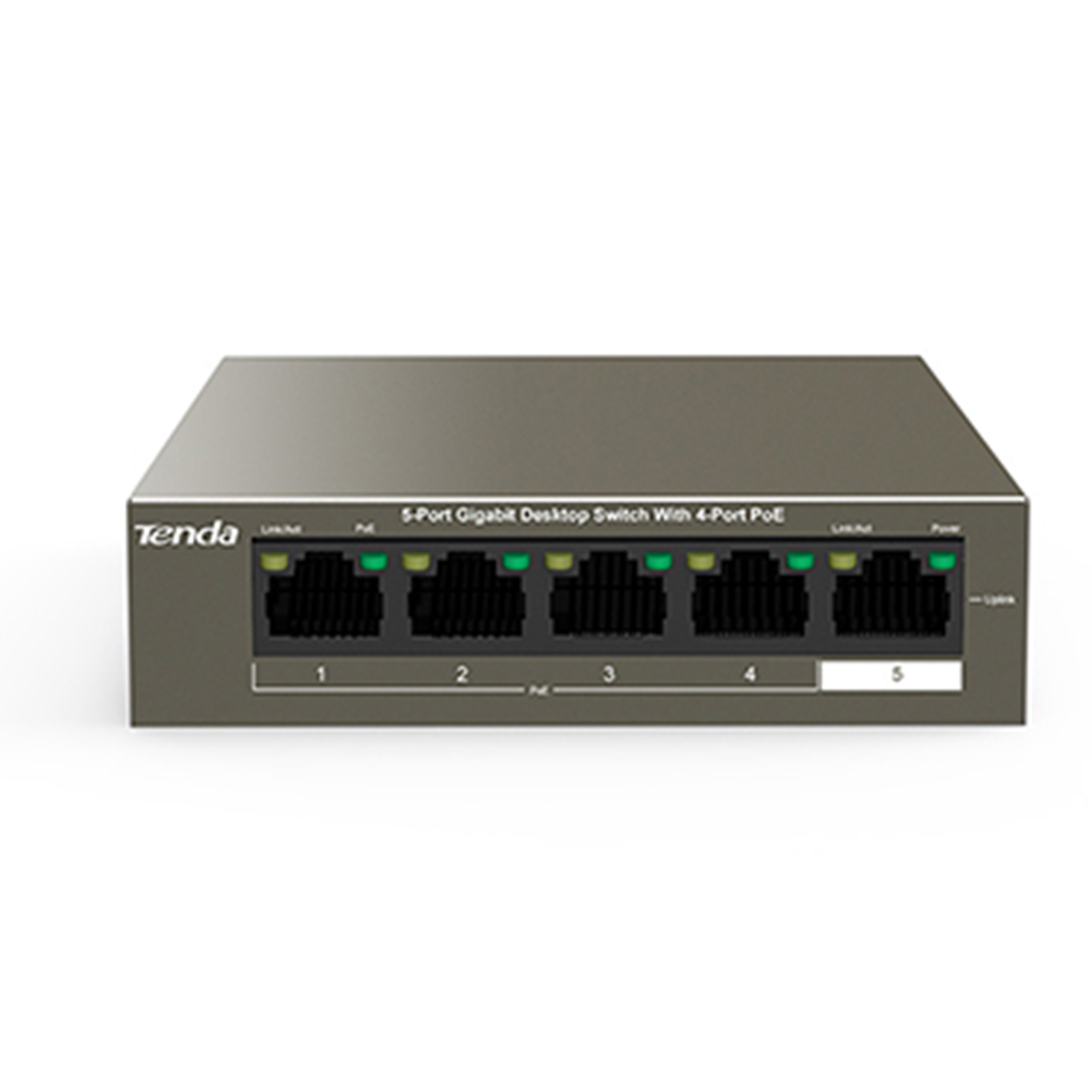 Tenda TEG1105P-4-63W è uno switch PoE che offre 5 porte RJ45 Base-TX 10/100/1000 Mbps. Le porte 1-4 sono conformi allo standard IEEE 802.3af (potenza massima PoE: 15,4 W) e allo standard 802.3at (potenza massima PoE: 30 W). Lo switch offre una potenza PoE massima di 58 W e può fornire alimentazione e scambiare dati con AP, telecamere IP e telefoni IP tramite l’utilizzo di cavi CAT5 (e categoria superiore). Fornisce inoltre la modalità di gestione VLAN.