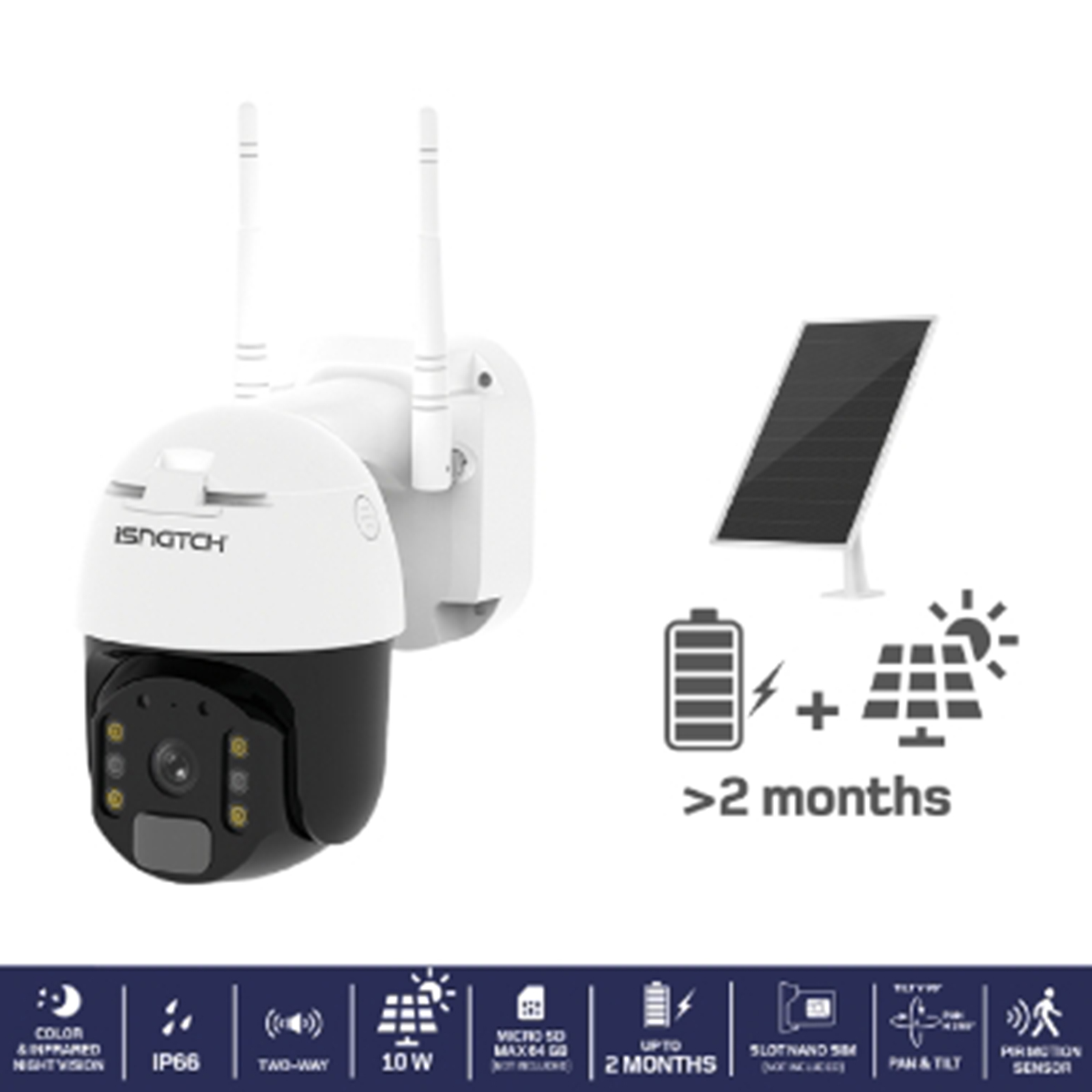 Telecamera motorizzata operativa con sim 4G, dotata di pacco batterie e pannello solare per prolungarne l'autonomia. La risoluzione video è FULL HD 1080p, funzione parla & ascolta grazie allo speaker e microfono integrati. Registra audio e video su MICRO SD (max. 64GB non inclusa) e invia notifiche push in caso di evento motion grazie sensore PIR integrato. Il pannello solare si collega al pacco batterie con un cavo da ben 2,8m che consente di orientare il pannello sul punto con maggior esposizione solare. Visione notturna a colori o infrarossi grazie ai LED bianchi e IR. HeyCam Move 4G è operativa operativa con l'App HeySmart che permette la visualizzazione in tempo reale, cattura foto, registra ed esporta i video presenti in memoria.