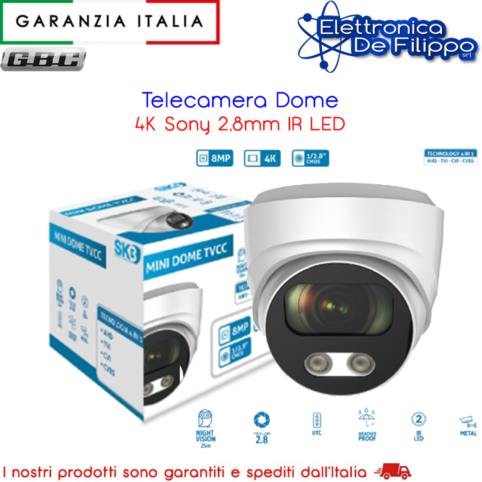 Telecamera A-HD 4in1 (AHD/TVI/CVI/CVBS) tipo Dome con sensore da 8M 1/2.8" Sony CMOS e risoluzione video 3840x2160 pixel, ottica fissa 2,8mm e visione notturna fino a 25m tramite 2 IR LED. Struttura in metallo adatta anche in esterni. Alimentazione 12VDC 500mA e connessione BNC.