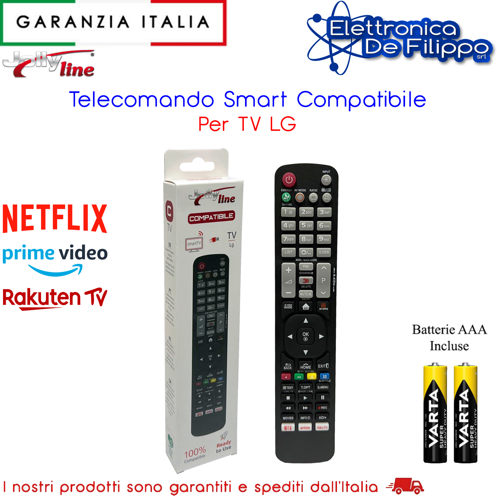 Comanda tutte le funzioni, Netflix, Prime Video, Rakuten TV, Menu, Av, Televideo, Colore