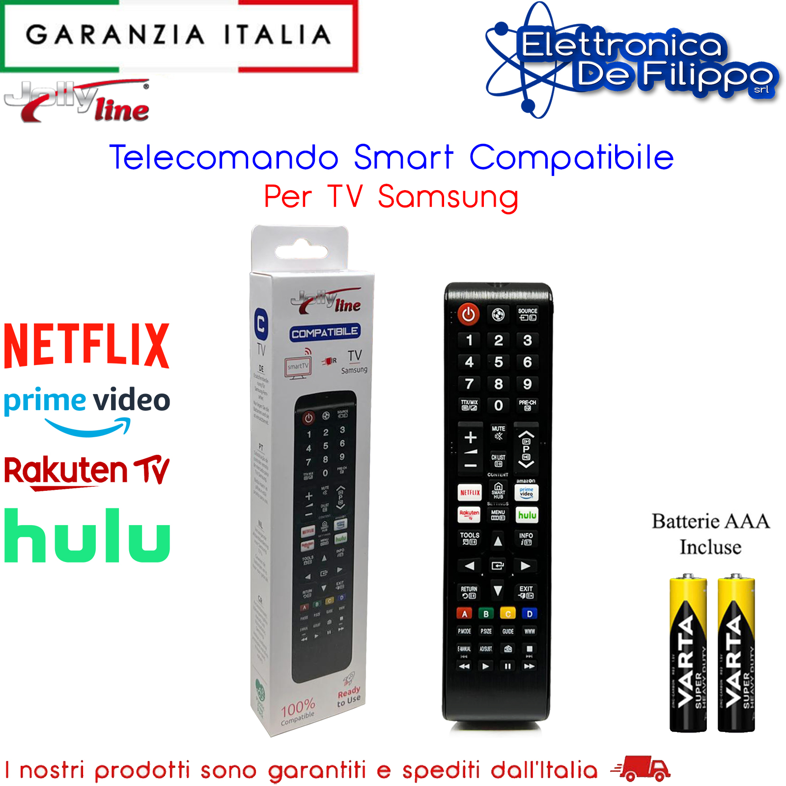 - Comanda tutte le funzioni, Netflix, Prime Video, Rakuten TV, Hulu, Menu, Av, Televideo, Colore