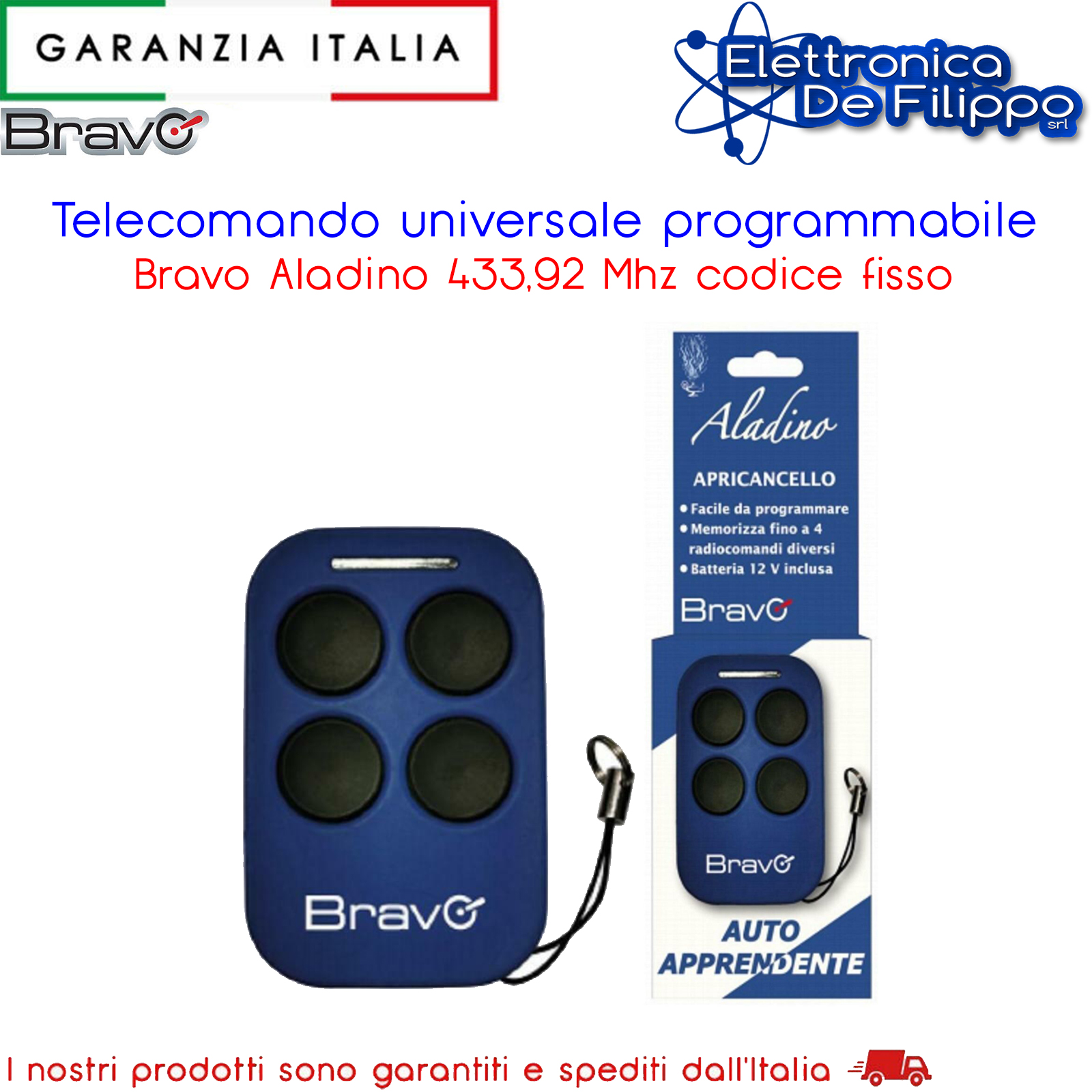Il radiocomando universale per cancelli Europenet Bravo Aladino lavora in radiofrequenza a 433,92 Mhz, la procedura di clonazione si effettua in autoapprendimento tra due telecomandi, quello già programmato e il nuovo telecomando.