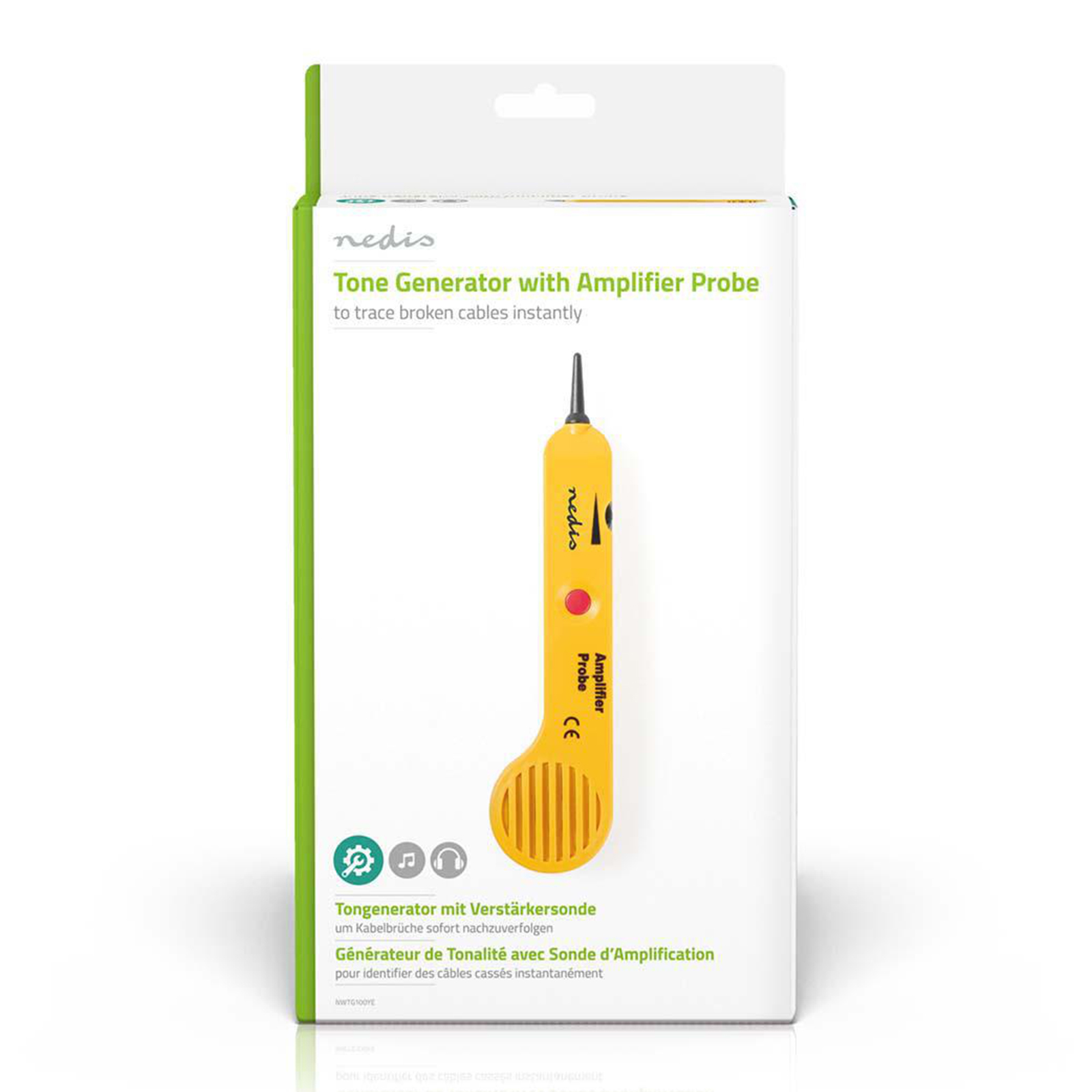 Questo generatore di toni con sonda amplificatore identifica e traccia fili o cavi all'interno di un gruppo senza danneggiare l'isolamento. Questo strumento è utile per l'installazione di reti e il controllo di oggetti. Il generatore di toni emette un singolo segnale o più segnali di frequenza e presenta due singole cartucce di prova e un giunto di prova 4 pin. Se i cavi sono legati e nascosti nella parete oppure sono integrati in una barriera mentre si utilizza il generatore di toni, è molto facile verificare con la sonda il segnale del tono che viene inviato dal telaio principale. La continuità di un filo, il guasto di un cavo, la polarità di un circuito o una rete oppure la tensione di lavoro di un cavo modulare possono essere tutti testati tramite questo tester di gruppo. Il percorso del circuito e il dettaglio della posizione possono essere valutati dalla luce pilota e dal tono dell'altoparlante.