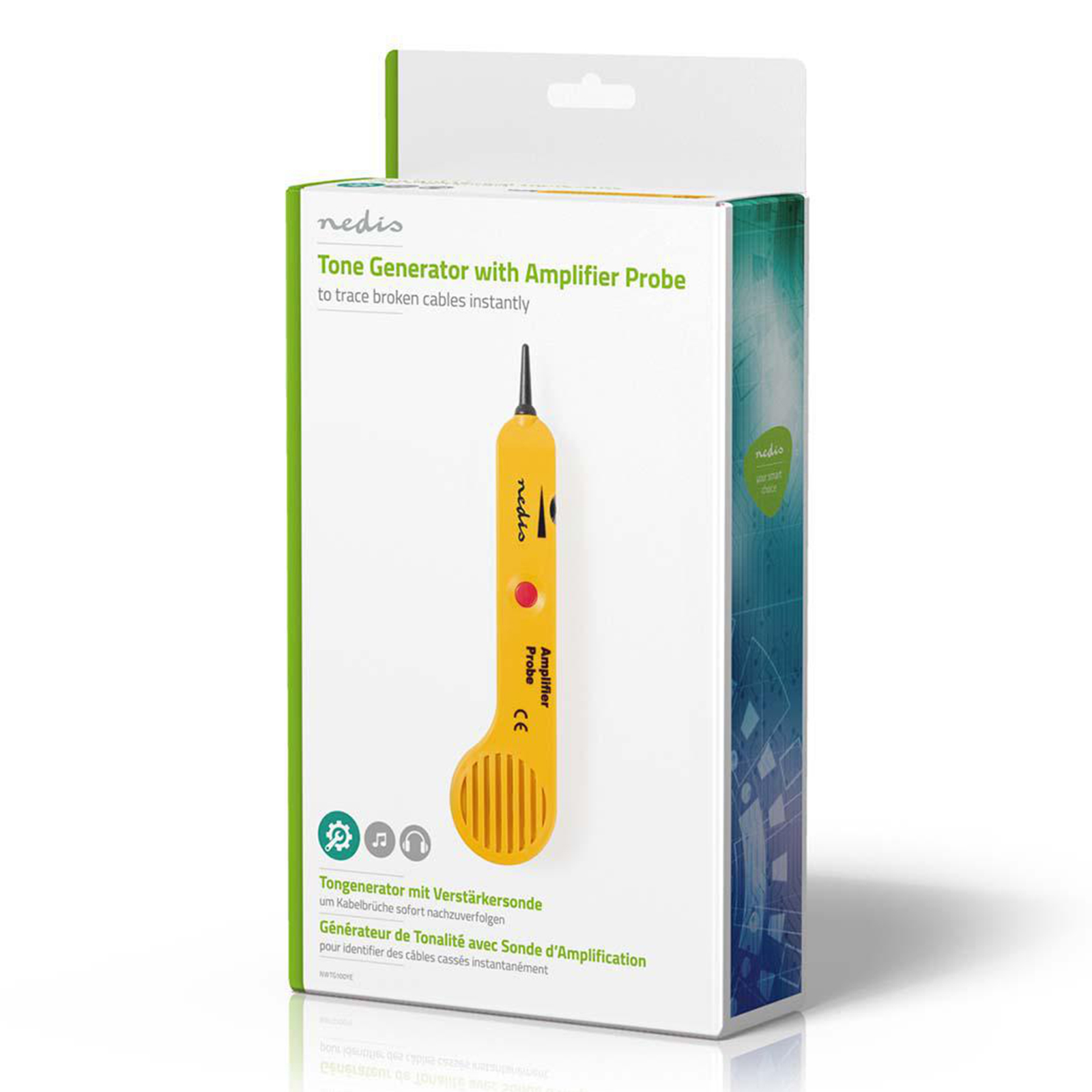 Questo generatore di toni con sonda amplificatore identifica e traccia fili o cavi all'interno di un gruppo senza danneggiare l'isolamento. Questo strumento è utile per l'installazione di reti e il controllo di oggetti. Il generatore di toni emette un singolo segnale o più segnali di frequenza e presenta due singole cartucce di prova e un giunto di prova 4 pin. Se i cavi sono legati e nascosti nella parete oppure sono integrati in una barriera mentre si utilizza il generatore di toni, è molto facile verificare con la sonda il segnale del tono che viene inviato dal telaio principale. La continuità di un filo, il guasto di un cavo, la polarità di un circuito o una rete oppure la tensione di lavoro di un cavo modulare possono essere tutti testati tramite questo tester di gruppo. Il percorso del circuito e il dettaglio della posizione possono essere valutati dalla luce pilota e dal tono dell'altoparlante.