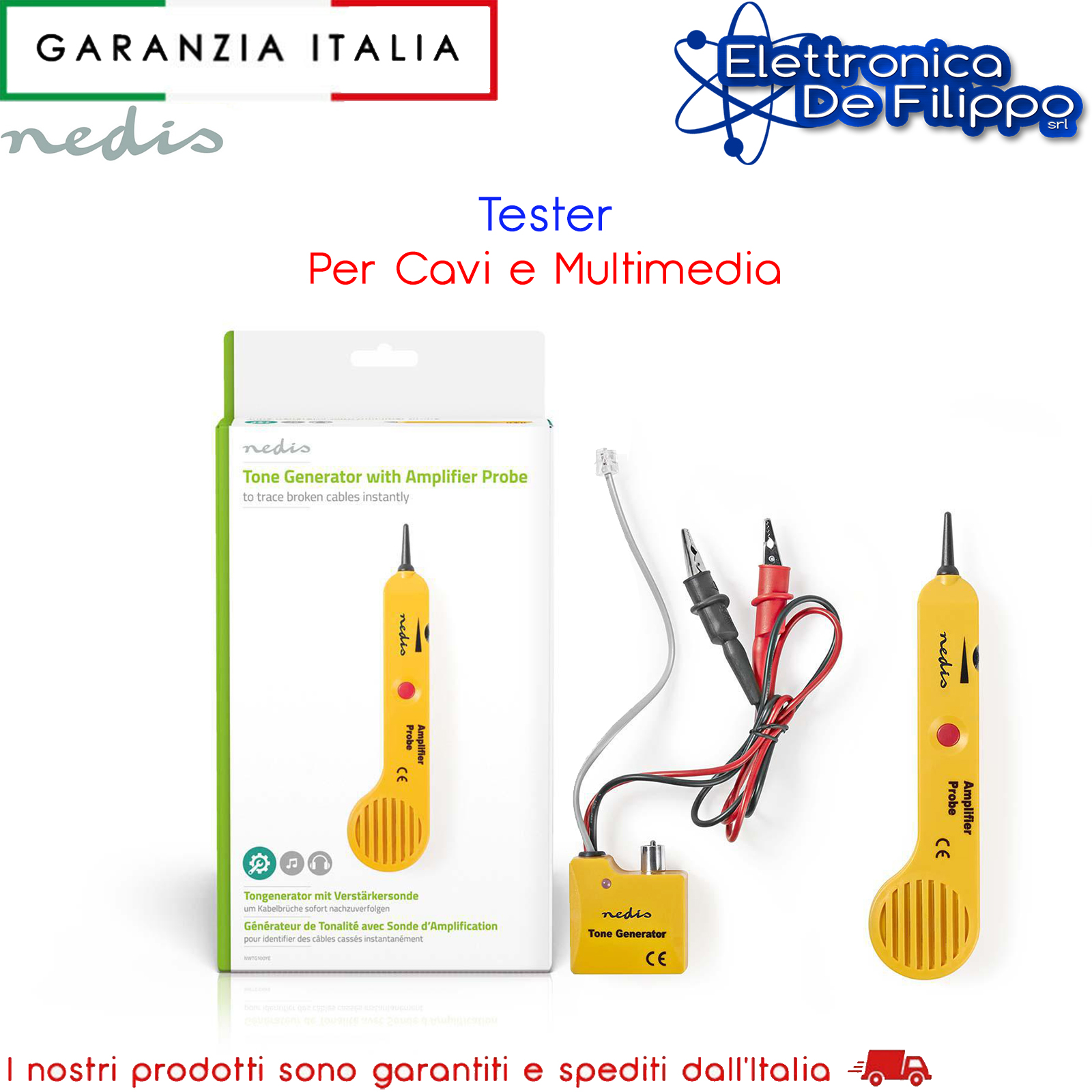 Questo generatore di toni con sonda amplificatore identifica e traccia fili o cavi all'interno di un gruppo senza danneggiare l'isolamento. Questo strumento è utile per l'installazione di reti e il controllo di oggetti. Il generatore di toni emette un singolo segnale o più segnali di frequenza e presenta due singole cartucce di prova e un giunto di prova 4 pin. Se i cavi sono legati e nascosti nella parete oppure sono integrati in una barriera mentre si utilizza il generatore di toni, è molto facile verificare con la sonda il segnale del tono che viene inviato dal telaio principale. La continuità di un filo, il guasto di un cavo, la polarità di un circuito o una rete oppure la tensione di lavoro di un cavo modulare possono essere tutti testati tramite questo tester di gruppo. Il percorso del circuito e il dettaglio della posizione possono essere valutati dalla luce pilota e dal tono dell'altoparlante.
