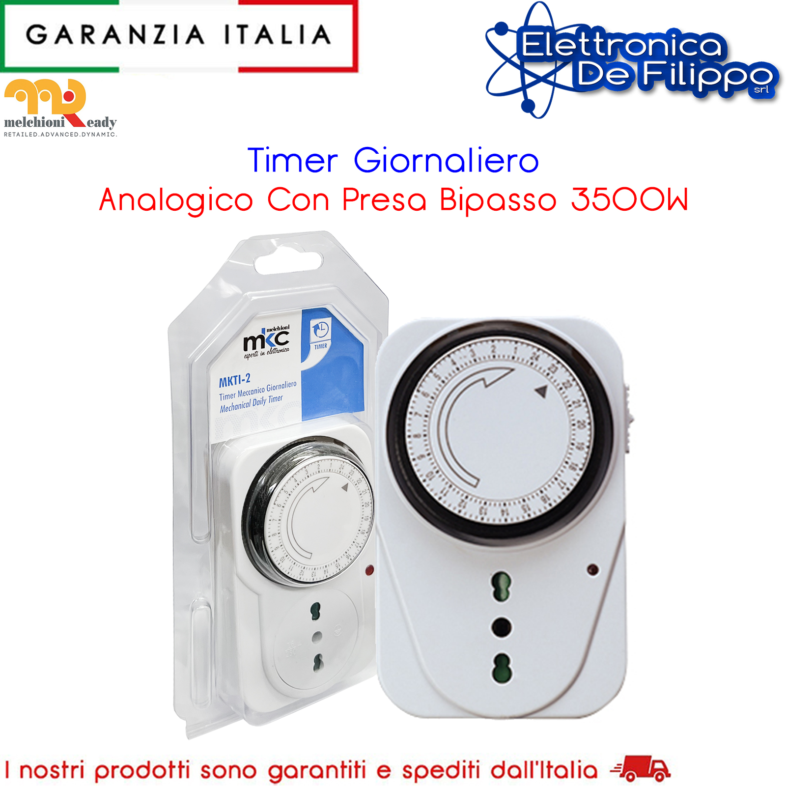Sei sempre fuori casa e al rientro trovi la casa fredda, il bucato da fare, accendere la plafoniera dell'acquario, la cena da scaldare? Ecco la soluzione a questi problemi il TIMER 24 ore PROGRAMMABILE! L'uso è semplicissimo basterà inserirlo in una comune presa e attaccarci sopra la spina dell'elettrodomestico da programmare; regola il timer all'orario scelto e il tuo elettrodomestico comincerà a funzionare. Hai bisogno di far partire la lavatrice nel pomeriggio ma sei a lavoro e non sai come fare? Programma l'accensione e al tuo rientro troverai la lavatrice già fatta... Programma il forno e al tuo rientro troverai la cena pronta e calda. La casa è fredda al tuo rientro? Programma l'accensione della stufa e al rientro troverai un caldo accogliente. Quando torni a casa e tutto è pronto per accoglierti. Ma non è tutto!! Qualsiasi elettrodomestico può essere connesso tranquillamente al TIMER. Comodo e utile grazie a questa presa puoi selezionare l'orario in cui si deve accendere e spegnere un componente una lampada e tanto altro,tutti i giorni, in più grazie a delle levette che circondano l'orologio puoi far accendere e spegnere svariate volte in una sola giornata. Una volta che imposti l’orario resta in automatico per sempre fino a quando non lo cambierai, ottimo per coloro che amano l’hobby dell'acquario dove la luce si deve accendere e spegnere in determinati orari tutti i giorni. La spina posteriore è il tipo grande, mentre la presa di ingresso anteriore potete usare sia la spina piccola che la grande. Il quadrante a disco mostra il tempo in 24 ore, movimento del disco a motorino, intervallo minimo di 15 minuti, supporta correnti fino a 3500 Watt, nella parte frontale la presa ha un attacco piccolo da 16A e un attacco grande da 16°, nella parte posteriore la presa ha un attacco grande da 16°. Comodo e utile grazie a questa presa puoi selezionare l'orario in cui si deve accendere e spegnere un componente una lampada e tanto altro,tutti i giorni. Il quadrante a disco mostra il tempo in 24 ore, movimento del disco a motorino, intervallo minimo di 15 minuti, supporta correnti fino a 3500 Watt.