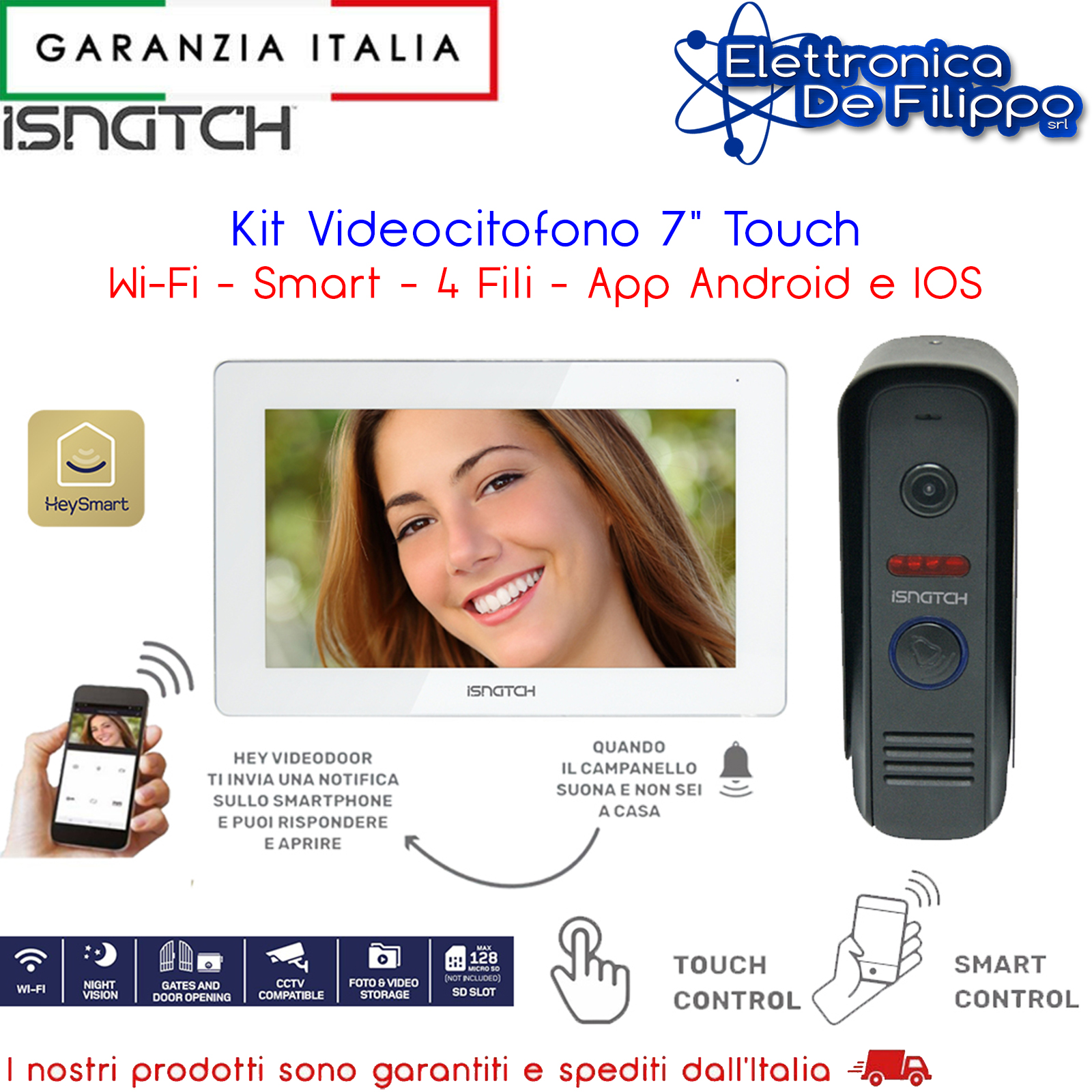 Kit videocitofono smart wi-fi, monitor 7" + unità esterna 1080p controllabile da remoto tramite l'applicazione Heysmart. Quando il tuo ospite suonerà il campanello, HeyVideoDoor invierà una notifica sul tuo smartphone e sarai libero di rispondere e aprire anche se non sei a casa. L'applicazione integra le funzioni di apertura porta esterna e accessi come garage, cancelli, barriere, ecc... Quando vuoi e comodamente dal tuo smartphone! Con HeyVideoDoor hai la possibilità di ampliare l'impianto fino a 4 monitor (1 master + 3 slave), 2 unità esterne e 2 telecamere TVCC. La slot micro SD consente inoltre di archiviare i video delle chiamate perse.