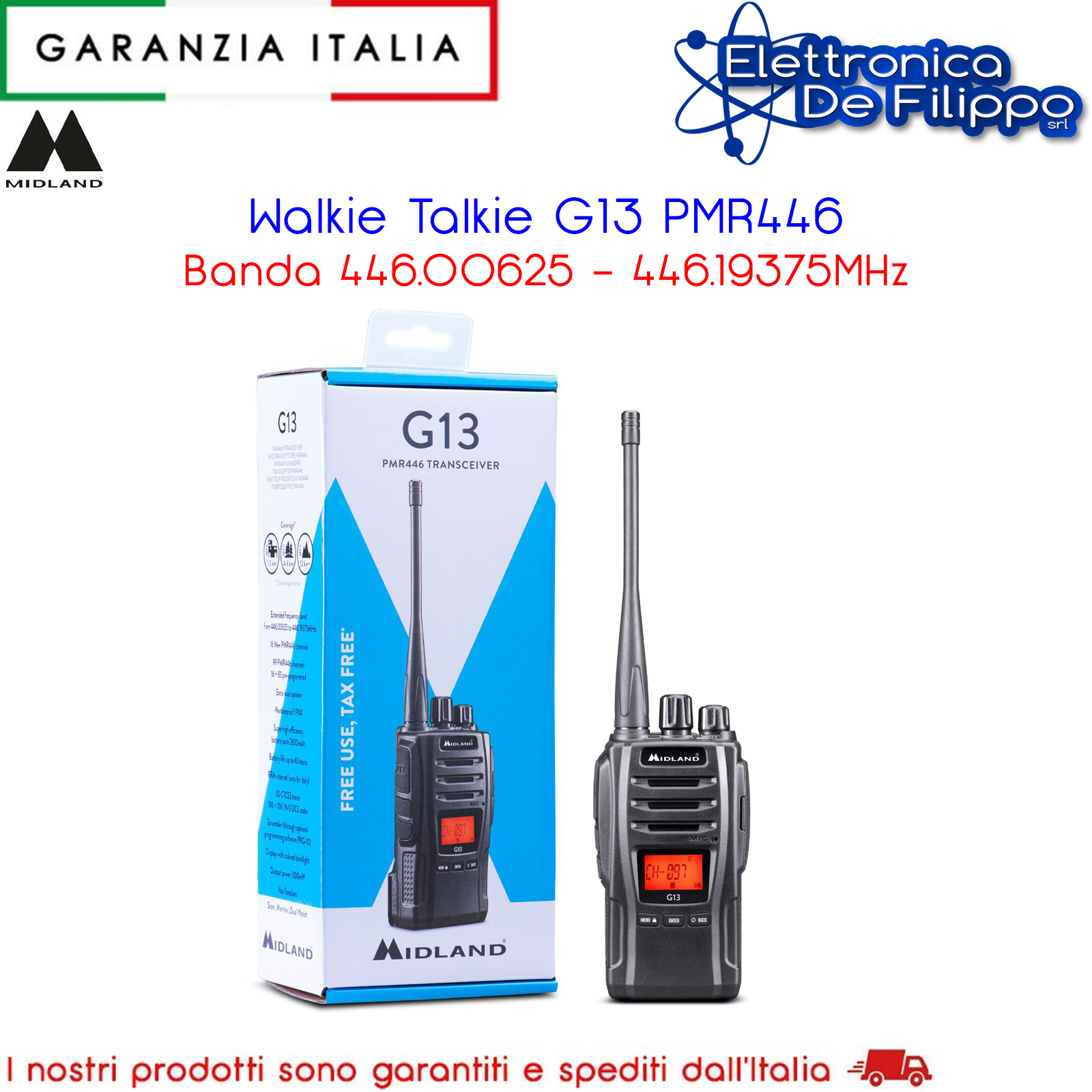 Chi pratica attivita? venatorie deve poter contare su una radio affidabile, versatile e dalla lunga durata. Se ti reputi un cacciatore esigenze e cerchi un walkie talkie capace di permetterti sempre di segnalare la tua presenza in zona di tiro... aggiungi al tuo equipaggiamento la nuova ricetrasmittente portatile G13. L’utente di riferimento chiede facilita? di utilizzo. G13 la raggiunge grazie a un layout comandi riconoscibile al tatto, un ampio display e le due manopole principali: la grande per il cambio canale la piccola per il controllo del volume e l’On/Off. Alla grande robustezza, permessa dallo chassis in alluminio, si aggiunge il grado di resistenza all’acqua IPX4. Valutando un ricetrasmettitore spesso ci si dimentica dell’audio... Non con il G13: Midland l’ha dotato di una risposta sonora dallo standard qualitativo ben sopra la media. La presenza della funzione RRM Channel (Rete Radio Montana) rende G13 un ottimo supporto anche per chi pratica escursionismo e trekking grazie alla possibilita? di selezionare in automatico la frequenza radio principale di Rete Radio Montana: strumento principe per segnalare emergenze. La batteria al Litio in dotazione offre una autonomia di utilizzo infinita ed il supporto di un circuito di ricarica rapida. G13 opera sulla gamma PMR446 (Personal Mobile Radio) frequenze 446.0-446.2 Mhz. Alle caratteristiche “pronto uso”, questo ricetrasmettitore aggiunge, via software, la possibilita? di programmare e personalizzare canali, attivare o meno funzionalita? specifiche.