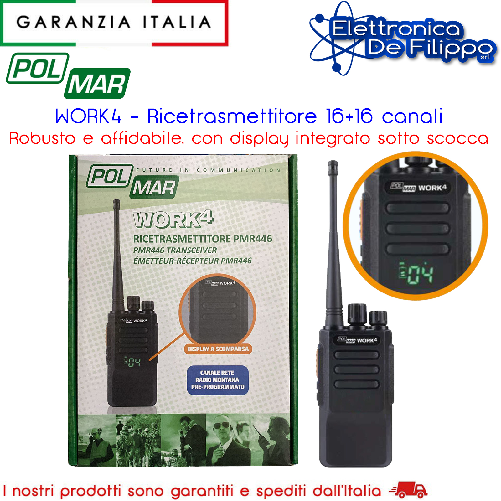 SPECIFICHE PRODOTTO Gamma di frequenza: 446.00625 MHz ~ 446.19375 MHz Canali di memoria: 16 + 16 Potenza uscita RF: 0,5W Tensione di esercizio: 7,4Vcc Alimentazione: batteria ricaricabile Li-Ion – 7,4Vcc/1700 mAh Temperatura operativa: -10°C - +50°C Sensibilità: 0,2 µV Uscita audio: 1W Dimensioni: 57 x 35 x 122 (227 antenna inclusa) mm Peso: 195 gr inclusa la batteria
