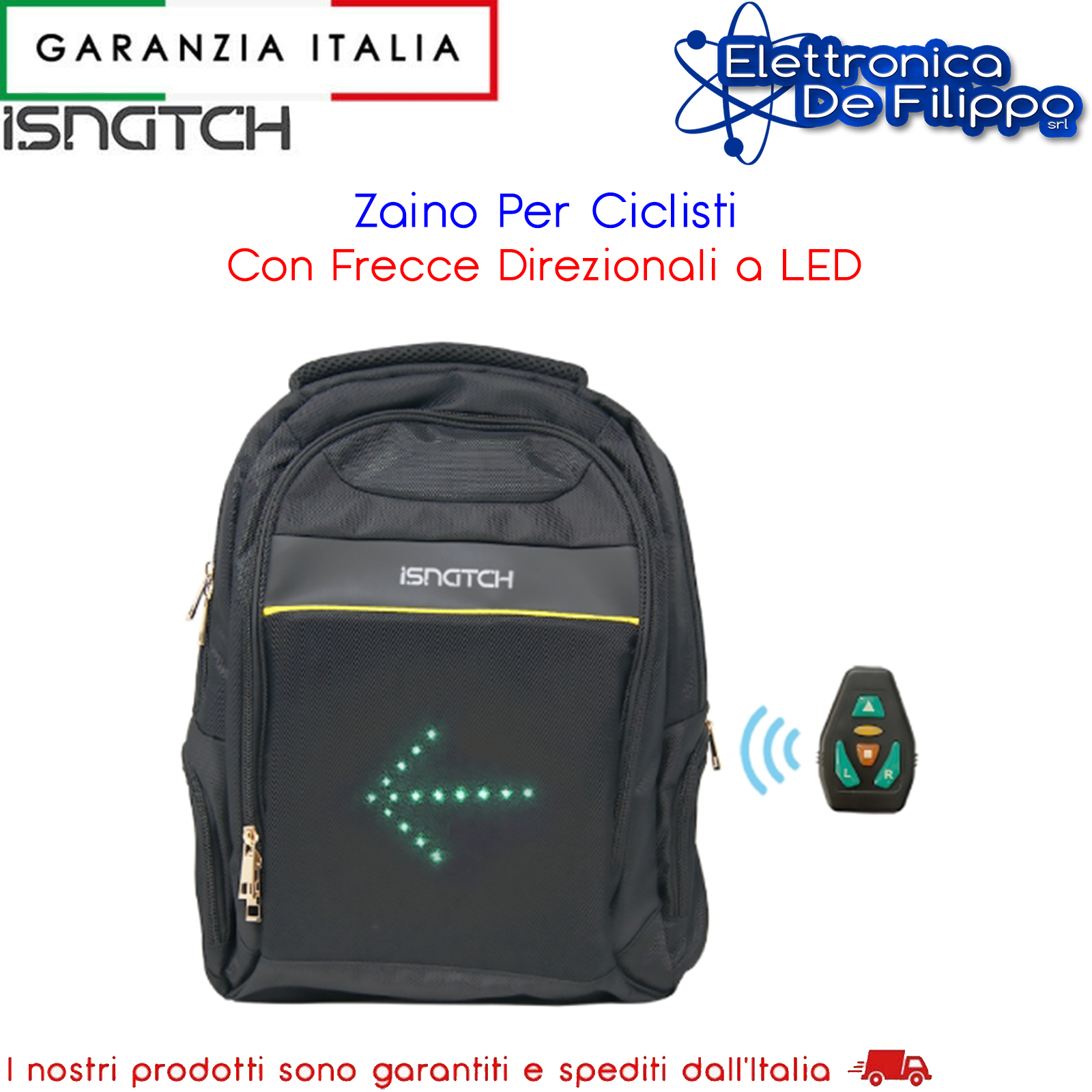 Zaino pensato principalmente per l'uso con biciclette e monopattini, permette di segnalare, ai veicoli che seguono, la manovra che si è in procinto di mettere in pratica mediante degli indicatori a LED attivabili col telecomando wireless applicato sul manubrio. Gli avvisi luminosi sono 4: indicatore Avanti, svolta Destra, svolta Sinistra e segnale di Stop. Lo zaino è dotato di cavo USB per la ricarica della batteria al litio di lunga durata. Doppia chiusura a zip, tasche esterne ed interne multiuso e scomparto dedicato all’alloggiamento di un Notebook o Tablet da 14” / 15”. Schienale e spallacci imbottiti e regolabili. Lo zaino è realizzato in nylon, il che ne permette un utilizzo anche durante le intemperie, con inserti riflettenti per aumentarne la visibilità. Colore nero.