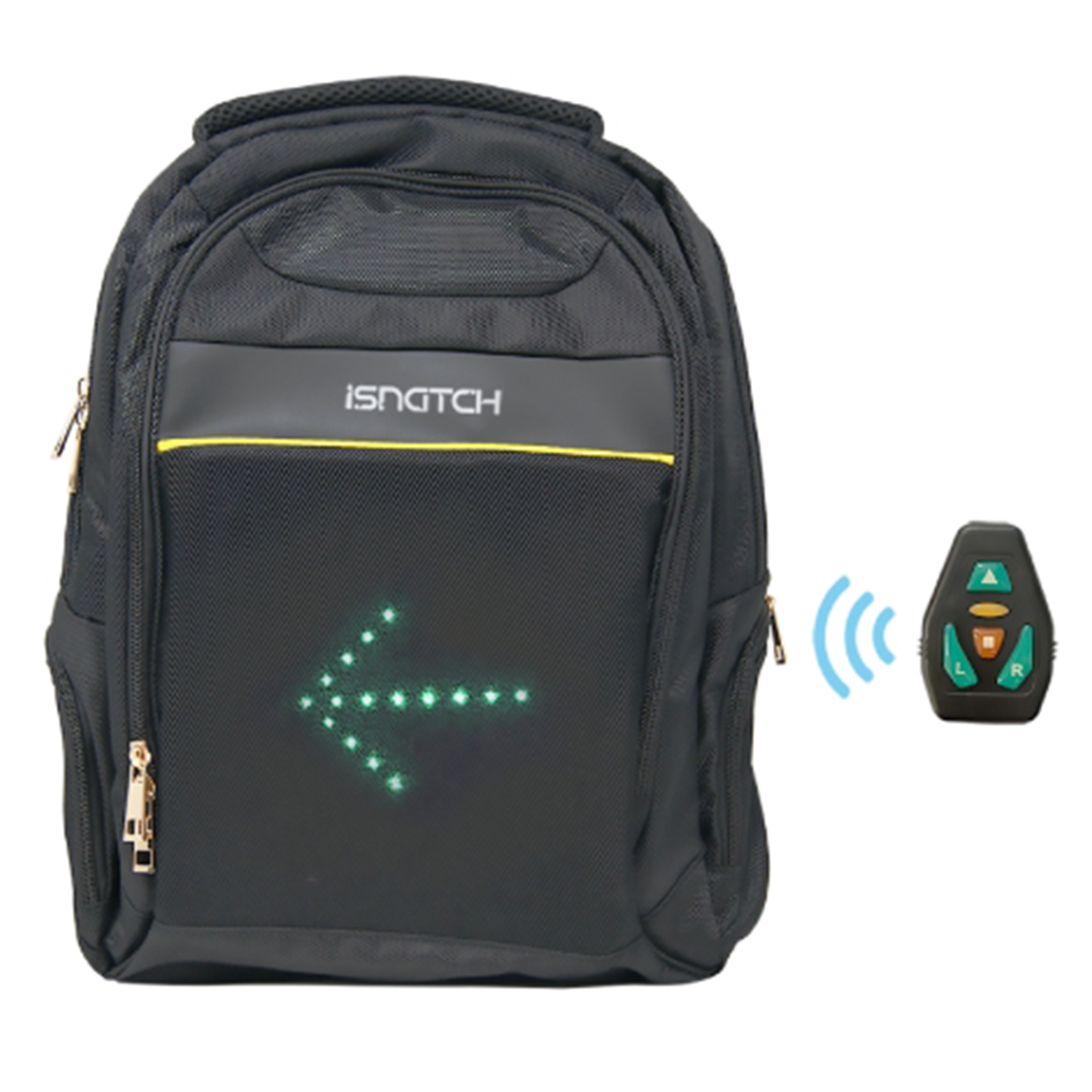 Zaino pensato principalmente per l'uso con biciclette e monopattini, permette di segnalare, ai veicoli che seguono, la manovra che si è in procinto di mettere in pratica mediante degli indicatori a LED attivabili col telecomando wireless applicato sul manubrio. Gli avvisi luminosi sono 4: indicatore Avanti, svolta Destra, svolta Sinistra e segnale di Stop. Lo zaino è dotato di cavo USB per la ricarica della batteria al litio di lunga durata. Doppia chiusura a zip, tasche esterne ed interne multiuso e scomparto dedicato all’alloggiamento di un Notebook o Tablet da 14” / 15”. Schienale e spallacci imbottiti e regolabili. Lo zaino è realizzato in nylon, il che ne permette un utilizzo anche durante le intemperie, con inserti riflettenti per aumentarne la visibilità. Colore nero.